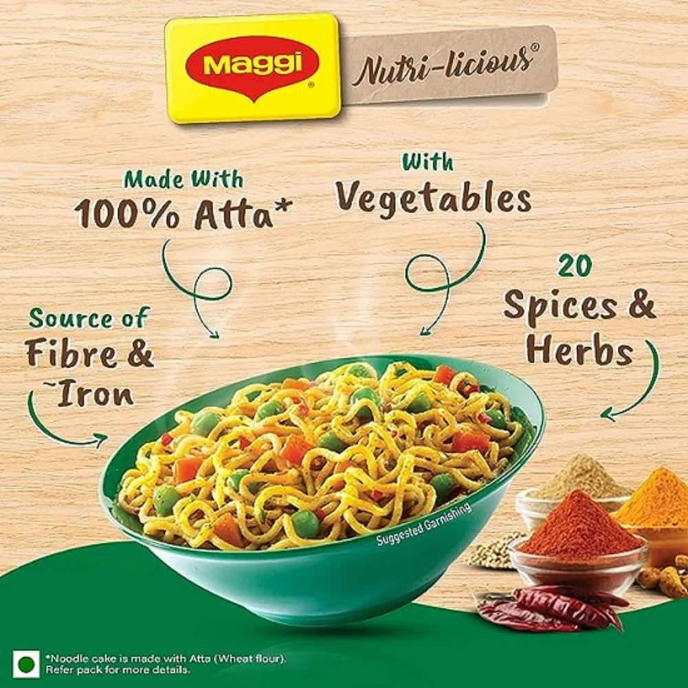 Key Features : Delicious MAGGI Veg Atta Noodles made with Atta and having colorful veggies! Made delicious with 20 spices & herbs A source of iron, fiber & protein Easy to cook, MAGGI Veg Atta noodles take just 3 minutes 157 quality checks done on spices
