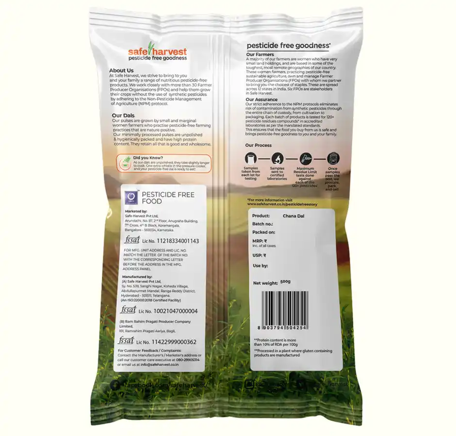 key features : Safe Harvest Pesticide-Free Unpolished Chana Dal is rich in protein and fiber, ideal for healthy meals, enhances taste and texture, sourced from India